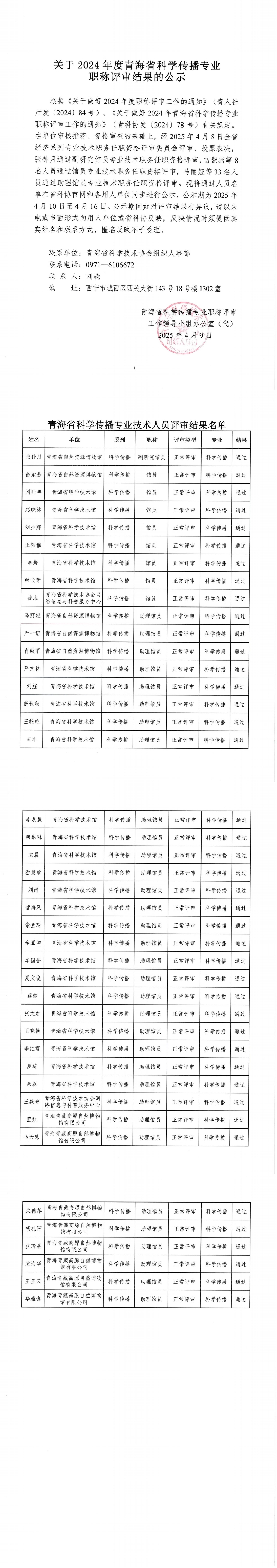 关于2024年度青海省科学传播专业职称评审结果的公示