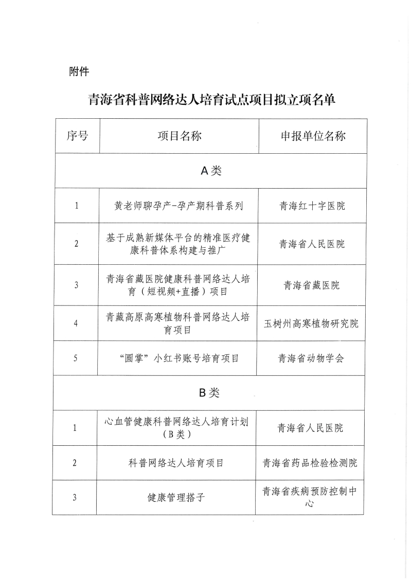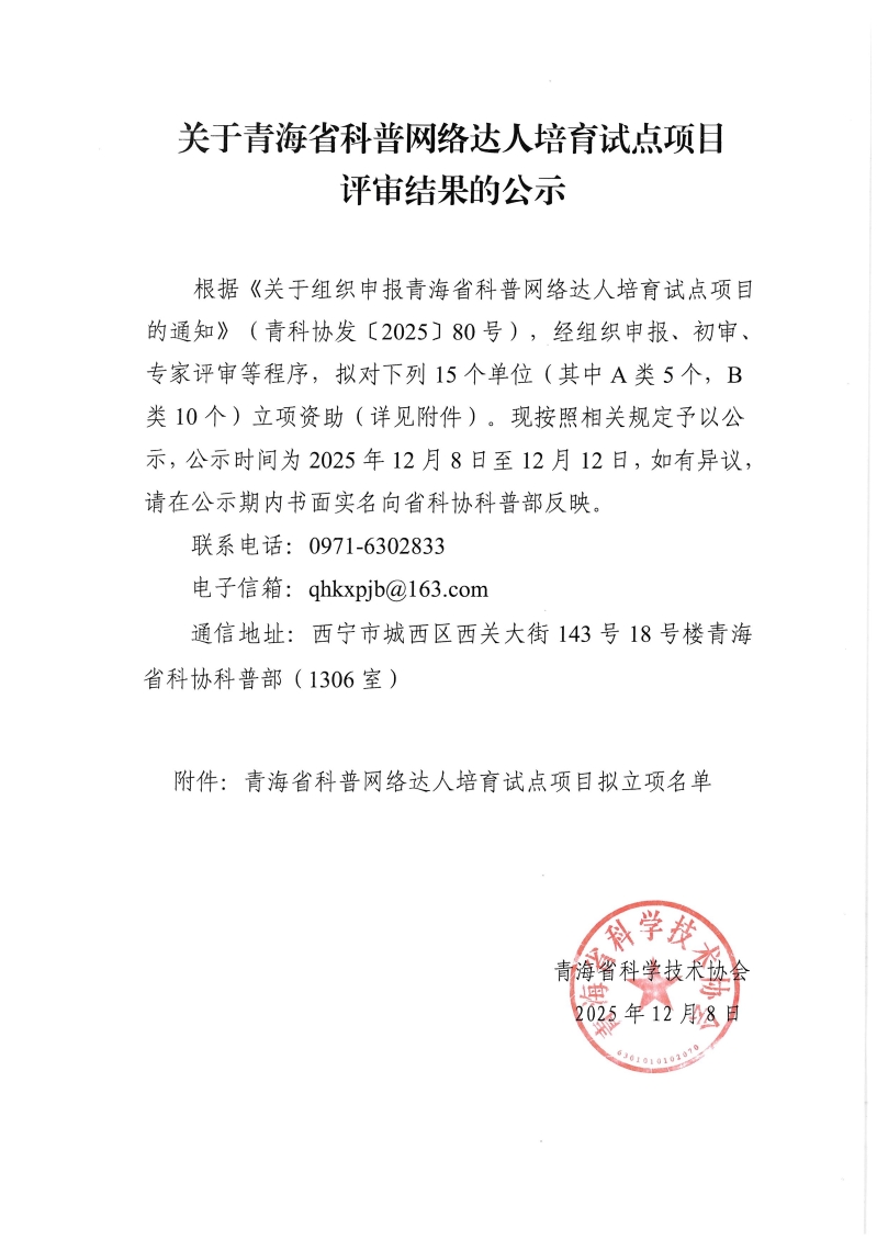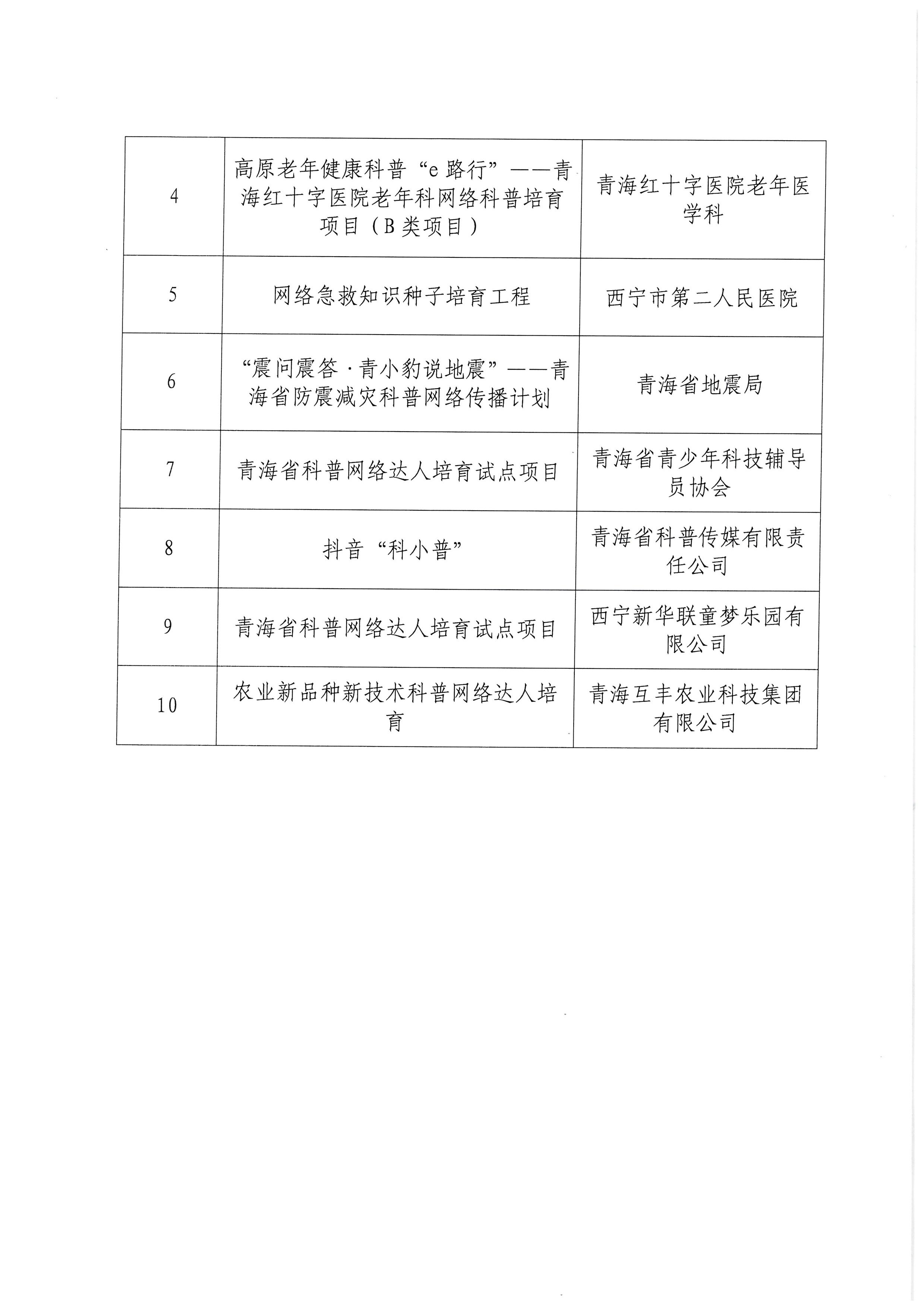 关于青海省科普网络达人培育试点项目评审结果的公示