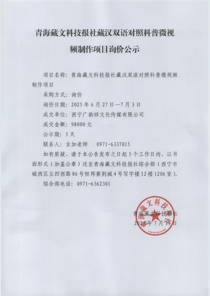 青海藏文科技报社藏汉双语对照科普微视频制作项目询价公示