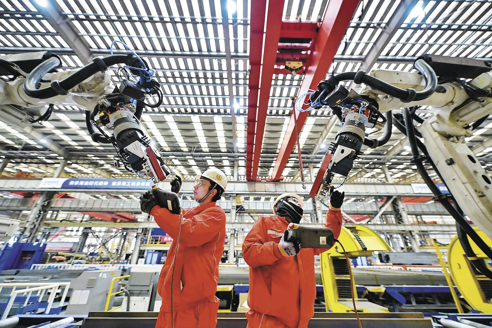 2026年1月29日,在天津市滨海新区,海上油气平台建设工人操作打磨机器人。 新华社发(杜鹏辉 摄)
