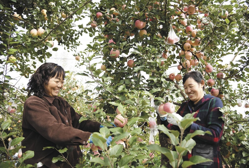 2025年10月17日,果农在陕西省延安市宝塔区桥沟街道烟洞沟村采收苹果。 新华社记者 张博文 摄