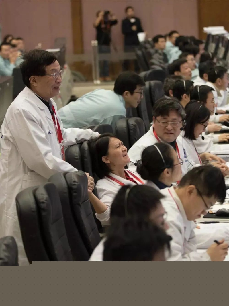 2019年1月3日,嫦娥四号成功落月的那一刻,74岁的叶培建(左一)静静走到嫦娥四号探测器项目执行总监张熇的身后,对她表示祝贺和鼓励。两代“嫦娥人”的手紧紧握在了一起。新华社记者 金立旺 摄